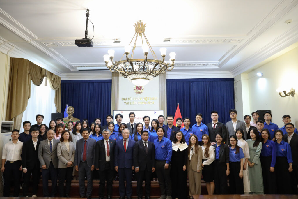 Chiều ngày 30/3/2025, tại phòng họp lớn Đại sứ quán đã diễn ra chương trình gặp mặt thanh niên – sinh viên và tuyên dương cá nhân tiêu biểu đạt kết quả học tập xuất sắc năm 2024. Sự kiện thu hút đông đảo đại biểu và gần 100 thanh niên, sinh viên tham dự, tạo cơ hội giao lưu, chia sẻ kinh nghiệm và vinh danh những tấm gương xuất sắc trong học tập và nghiên cứu.