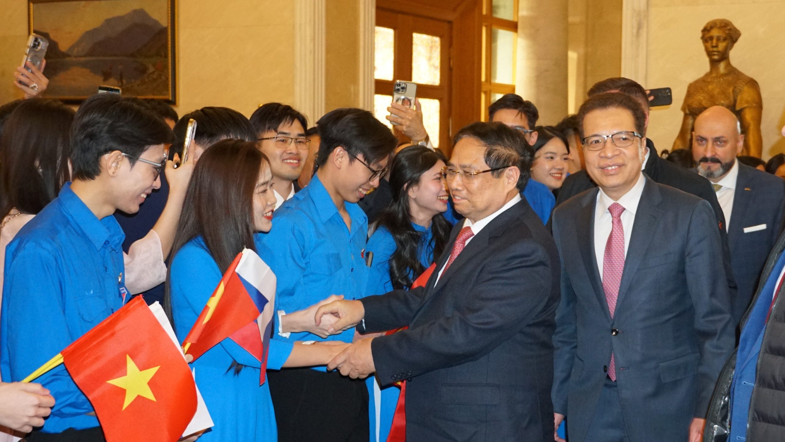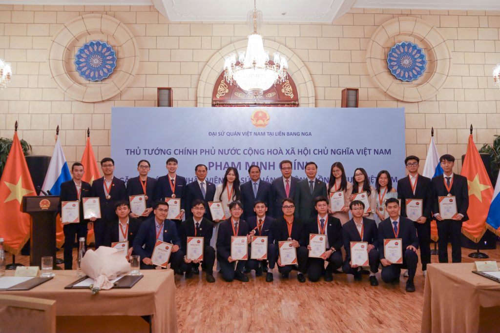Trong không khí buổi gặp gỡ, Thủ tướng cũng ghi nhận và biểu dương những đóng góp tích cực của cộng đồng người Việt Nam tại Liên bang Nga, đặc biệt là thế hệ trẻ. Nhân dịp này, 30 cá nhân tiêu biểu đã được trao Giải thưởng Quỹ Khai sáng năm 2026 và vinh dự nhận sự biểu dương trực tiếp từ Thủ tướng, chụp ảnh lưu niệm và cũng đã trao tặng bức tranh lưu niệm tới Đại sứ quán Việt Nam tại Liên bang Nga.