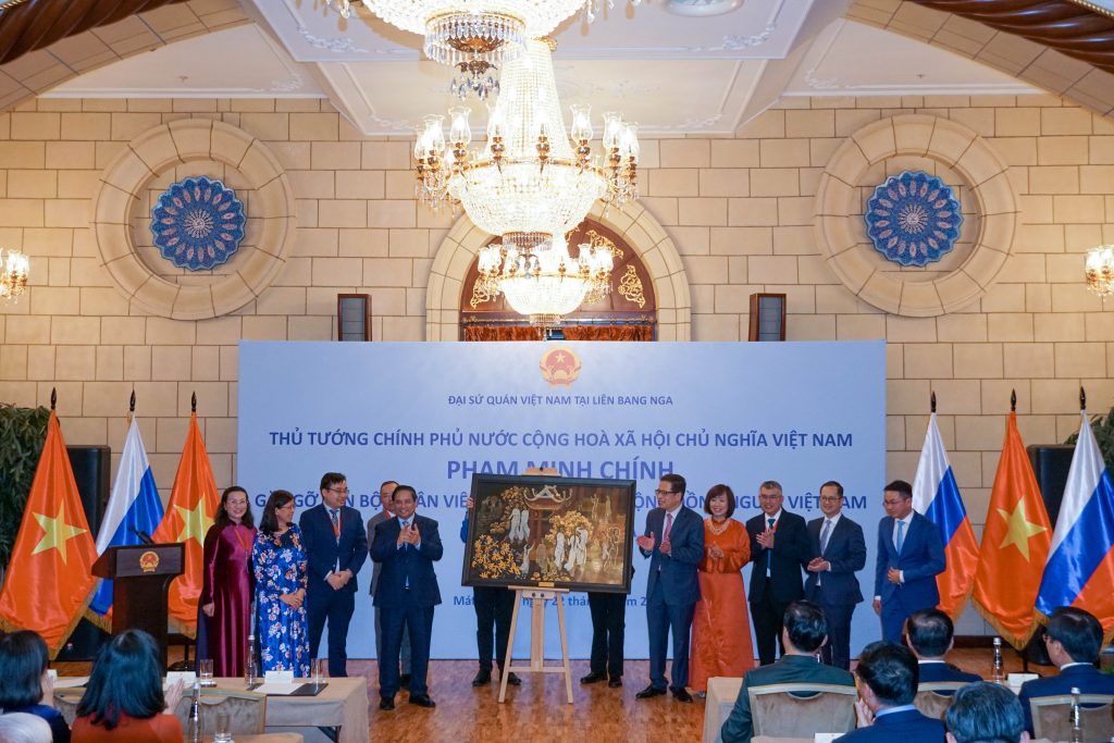 Tối cùng ngày, Thủ tướng đã có buổi gặp gỡ cán bộ, nhân viên Đại sứ quán và đông đảo bà con kiều bào tại Liên bang Nga. Cùng dự có Phó Thủ tướng Trần Hồng Hà, Phó Thủ tướng Bùi Thanh Sơn và các thành viên trong Đoàn đại biểu cấp cao Việt Nam. Tại buổi gặp gỡ, Đại sứ Đặc mệnh Toàn quyền nước CHXHCN Việt Nam tại Liên bang Nga Đặng Minh Khôi đã báo cáo về tình hình cộng đồng người Việt Nam tại Nga. Phát biểu tại buổi gặp mặt, Thủ tướng Phạm Minh Chính đã gửi lời thăm hỏi, lời chúc tốt đẹp tới cộng đồng người Việt tại Nga, đồng thời ghi nhận, đánh giá cao tinh thần đoàn kết và những đóng góp của bà con đối với sự phát triển của đất nước cũng như quan hệ hữu nghị Việt Nam – Liên bang Nga.